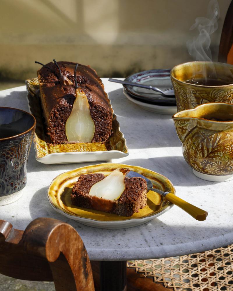 Bjud in till tekalas med vackraste kakan i skördetider. Här har vi lagt hela päron i chokladsmeten och sedan gräddat allt i ugnen så att päronen blir mjuka. När du skär upp bitar och serverar blir den redan vackra päronkakan ännu vackra med päronfyllning i mitten.