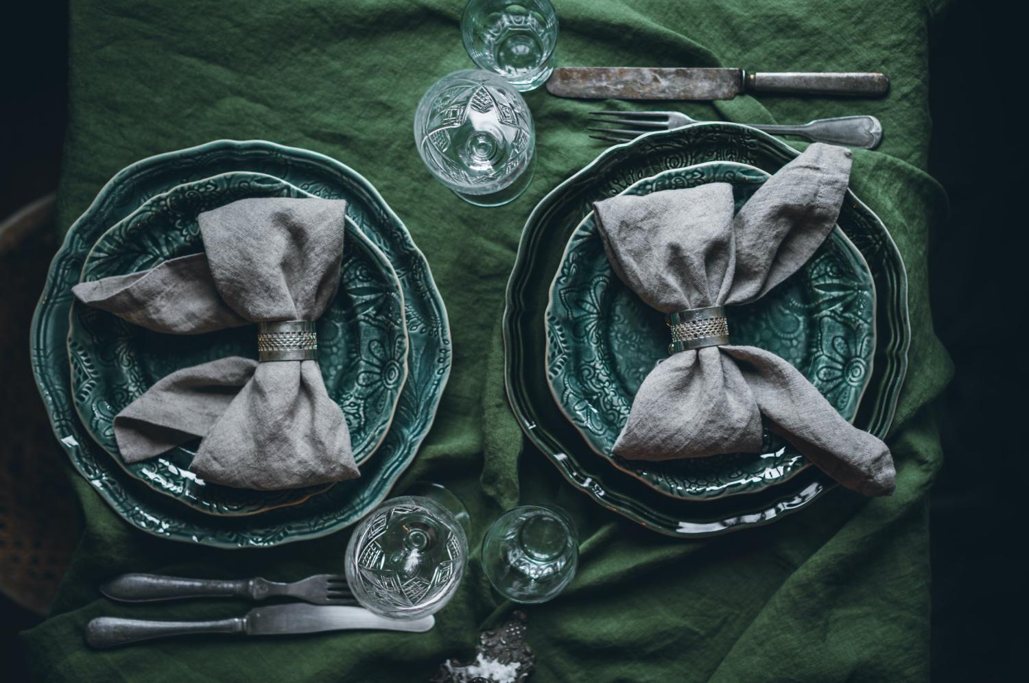 Här har fotografen Linda Lomelino knutit ihop dukningen genom att forma linneservetten till en rosett.
