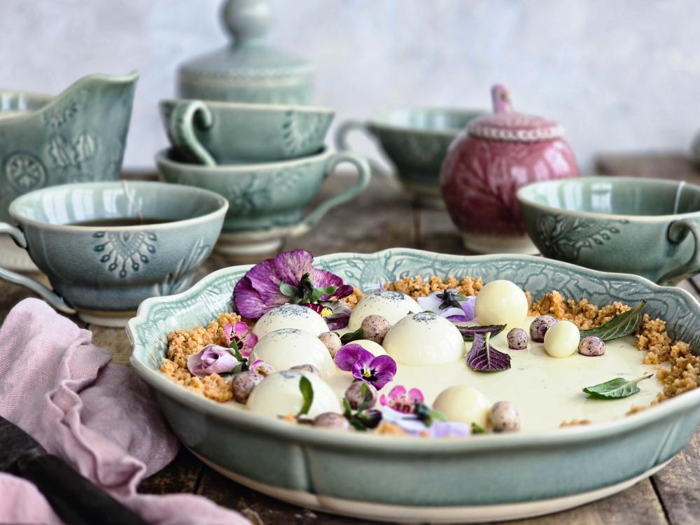 Vad sägs om pannakottapaj med smak av brynt smör & chokladgömma, serverad i pajform i serien Arabesque från Sthål. Receptet här nedan är från Anna Caroline Magnusson som driver Instagramkontot @annacarolinebakar. De runda bollarna är extra pannacotta som hon fryst in i silikonformar och stjälpt upp som dekoration. Därefter toppat dem med en gnutta vanilj och låtit dem ta plats på pajen med blommor och blad. Ett riktigt litet konstverk.