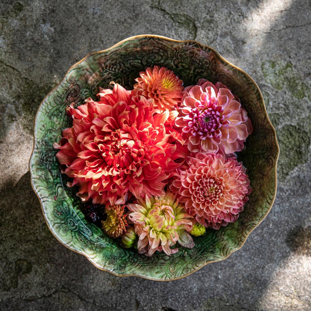 Ingen har väl missat Dahliatrenden. Tidigt på våren väcks knölarna till liv för att senare under sommaren slå ut i full prakt. Eftersom stjälkarna är relativt korta är passar det i små vaser eller som här i en fin skål. Dahlian kom till Europa som matväxt, men var ingen delikatess direkt. Istället var det de makalöst vackra blommorna som vann gehör – inte minst Napoleons hustru Joséphine Bonaparte var en hängiven entusiast. Den svenske botanisten Anders Dahl var en av Linnés lärljungar och han är den som gett namn åt växtgruppen.