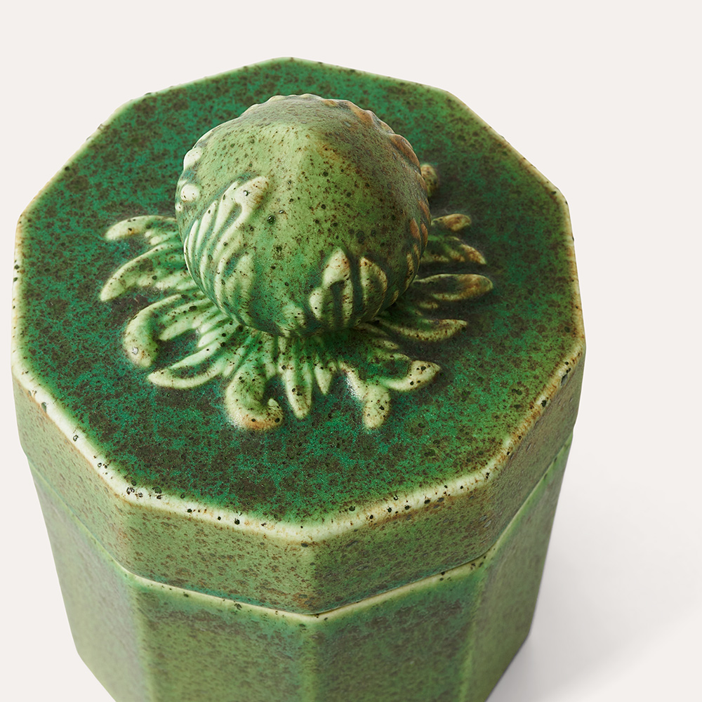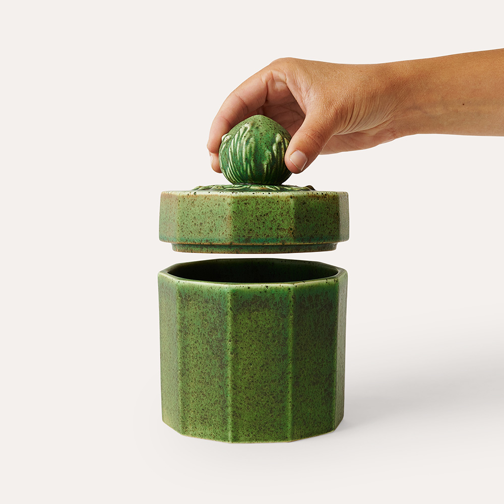 Burken är av vitt lergods med ett skulpterat lock som glaserats med en jordfärgad glasyr. Lera och glasyr är levande material och ibland med vissa färger uppkommer helt naturliga krackeleringar i glasyren. Detta är endast i ytskikten och inget som påverkar kvaliteten. Burken är inte avsedd för förvaring av mat.