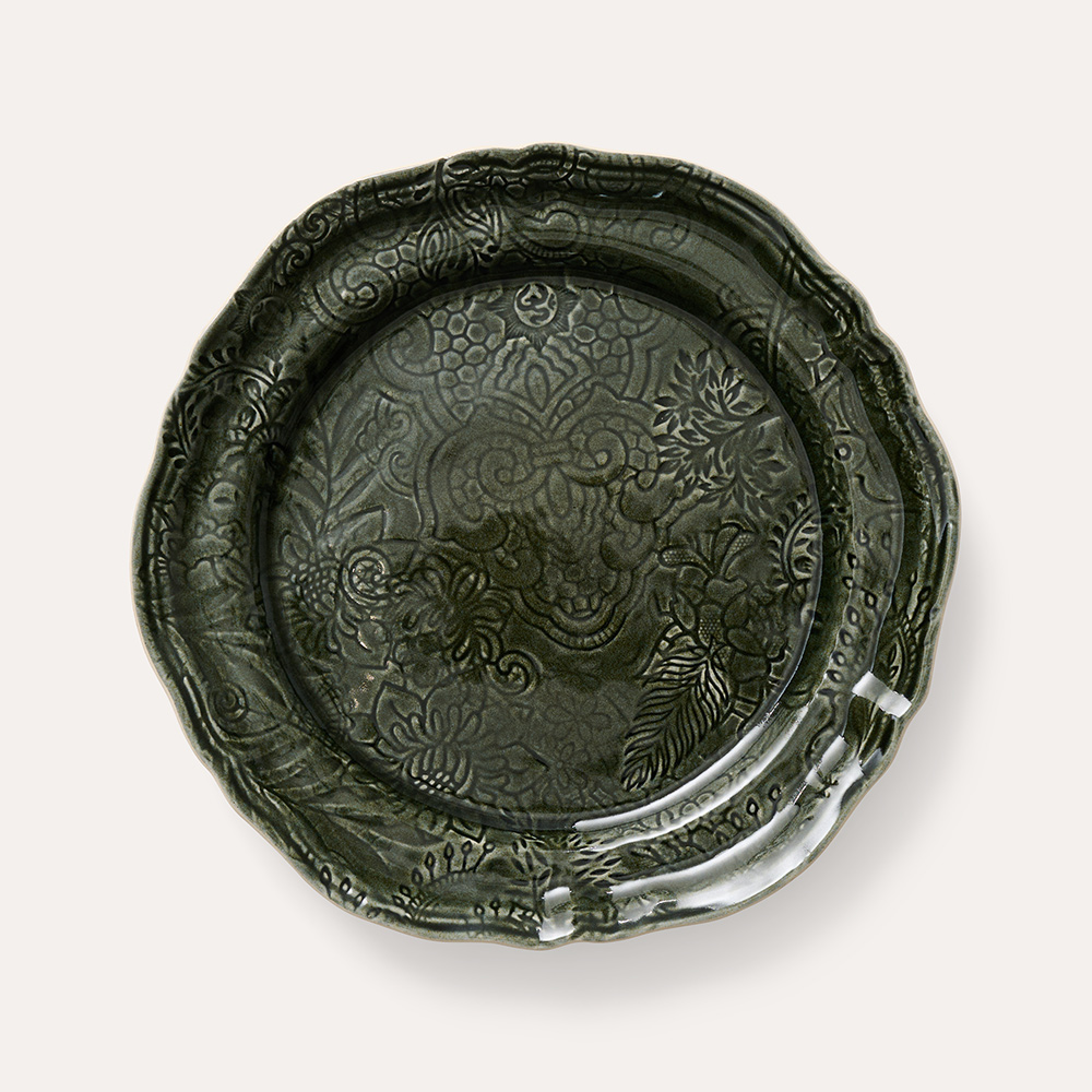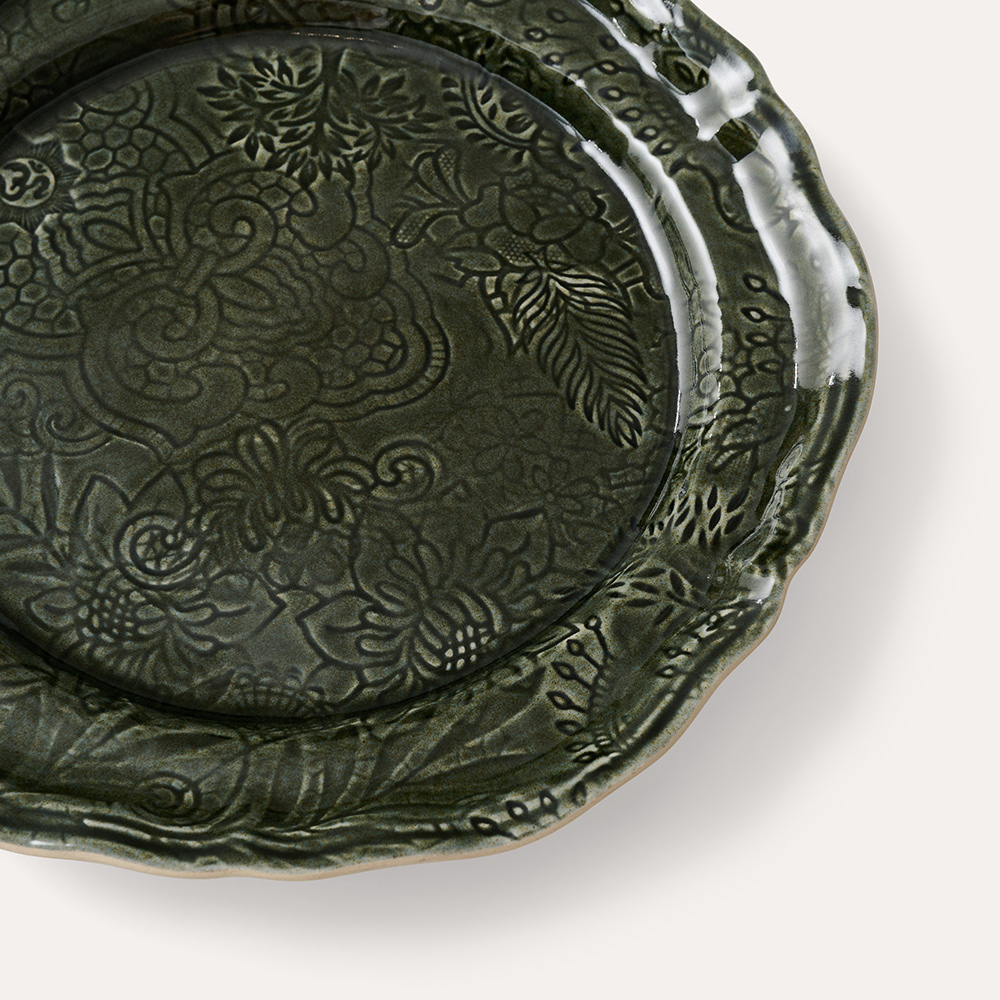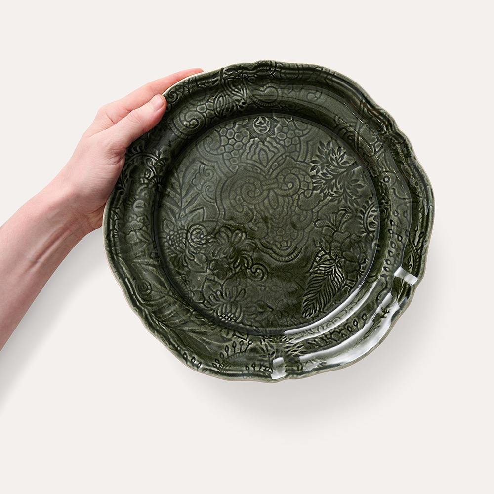 Elegant mattallrik där det stilfulla motivet vackert faller ut över tallriken och breder ut sig i det vågiga brättet.