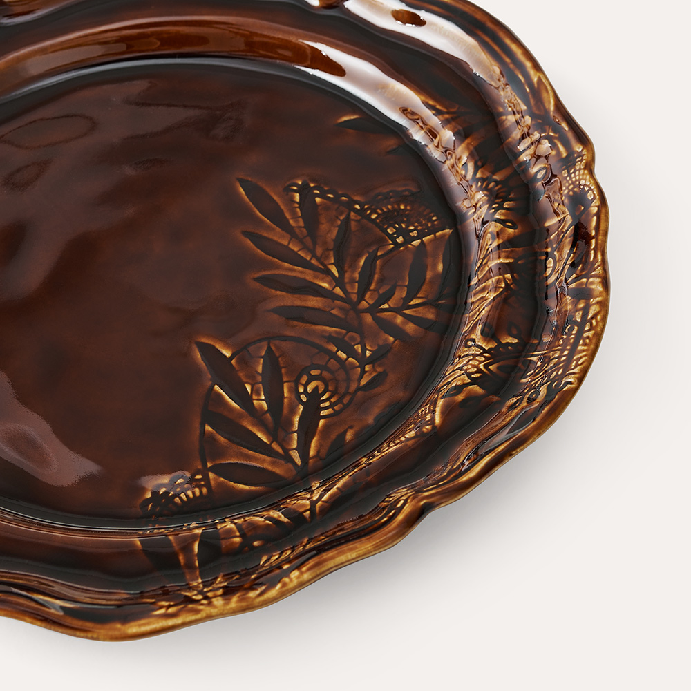 En användbar mattallrik som får den enklaste mat att se elegant ut. Tallrikens vågiga form ger mjuk och varm stämning på bordet. Det smakfulla mönstret på tallriken och brättet visar att det är Sthåls kollektion Arabesque. Som allt annat i serien, kan också tallriken användas i ugn, mikro och diskas i maskin. Glasyren flödar över det orientaliska mönstret och ger ett livfullt intryck som är så vackert. En varm kaffebrun ton passar till både varm och kall mat i alla möjliga kulörer.
