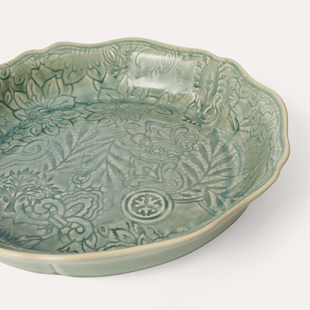 Den runda pajformen i antikgrön keramik kommer från serien Arabesque och passar för alla fester. Det finns ingen hejd på hur ofta man kan använda pajformen. Till middag, lunch, fika eller på buffén? Paj serveras med fördel till förrätt, huvudrätt, dessert eller fika. Den kanserveras varm eller kall och i den här vackra formen i keramik är den dessutom vacker att se på. Det bästa är att man ofta kan göra pajen i förväg och slippa stressa när gästerna kommer. Pajformen är ugnssäker och kan såklart rymma mer än bara paj, den blir även användbar för gratänger och annat gott som behöver en ugnsform. Ställ den på bordet och ta emot gästernas jubel.