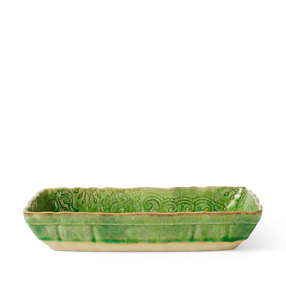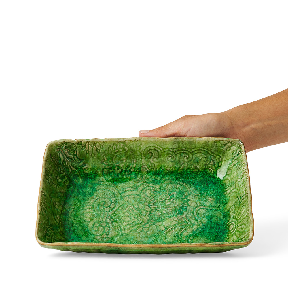 En perfekt liten gratängform som inspirerar matlagningen. Den passar utmärkt som både uppläggningsfat och gratängform, allt i ett. Vacker att duka fram och så läcker att laga mat i. Medan du ägnar dig åt annat, klarar gratängformen sig själv i ugnen. Den tåliga keramiken från Sthål klarar både ugn, mikro och kan diskas i maskin. Sätt igång kreativiteten. Laga en god grönsaksgratäng och låt smakerna mogna i ugnen. Eller vad sägs om en liten paj till efterrätt? Duka fram och njut av att det blir både läckert att se på och att äta. Vad du än lagar så blir det en läckert att titta på. Det vackra sirliga mönstret som tecknar sig i den gröna glasyren utmärker vår serie Arabesque. Färgen, formen och generösa storleken gör att gratängformen kommer att bli en älskad vän i köket. Grönt är så mycket mer än bara grönt. Den sjögräsgröna effektglasyren innehåller en palett av nyanser och färgskiftningar. En glasyr som gör att god mat ser ännu godare ut.