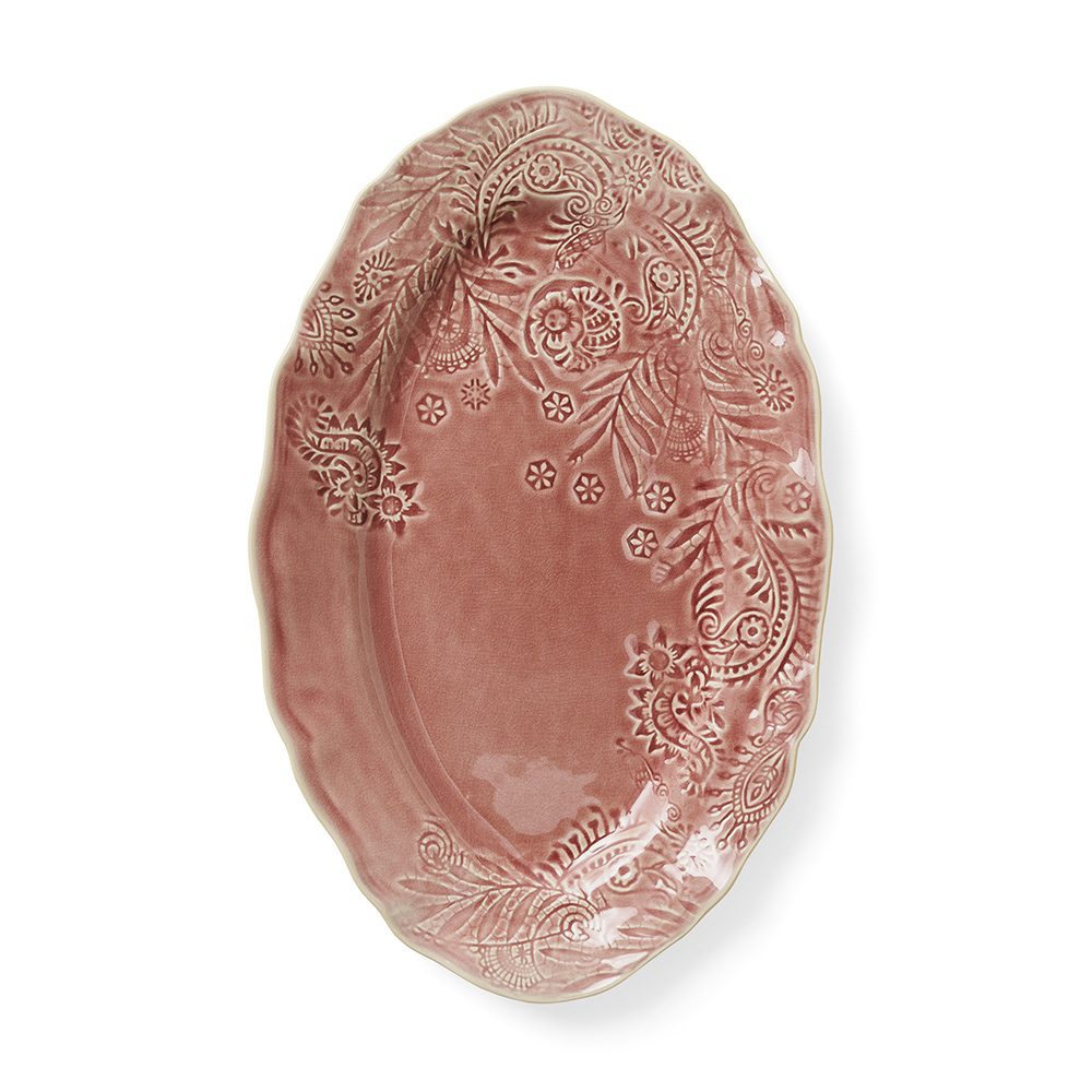 Stämningshöjande uppläggningsfat. Den här fantastiska ovala fatet är alltid välkommet. En pigg glasyr. Var beredd på kärlek vid första ögonkastet. Det flirtar bra med såväl middagsmat som desserter. Den vackra gammelrosa färgen lockar fram det bästa i både värdfolket och gästerna. Glasyren ger liv åt keramiken med vackra färgvariationer. Inget fat är det andra likt, men alla väcker samma härliga aptit. Fatet är en del av Sthåls keramikserie Arabesque och passar därför med resten av det smakfulla sortimentet.