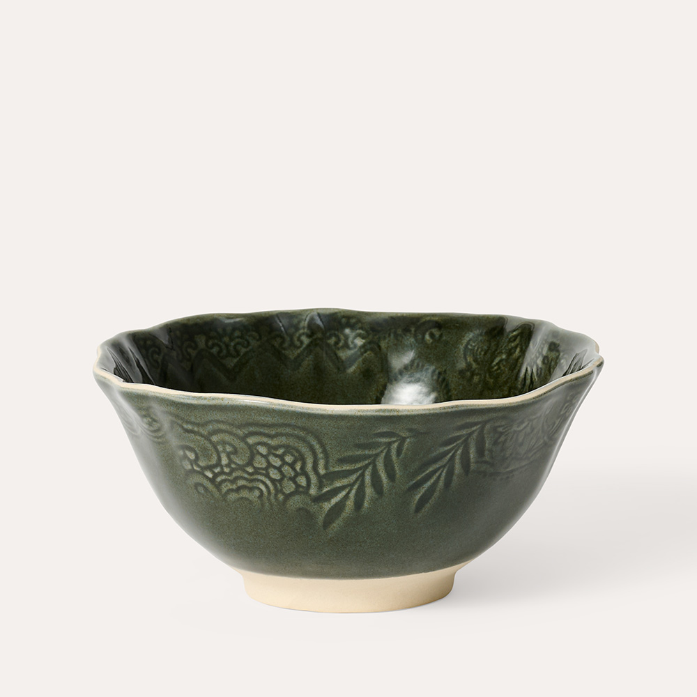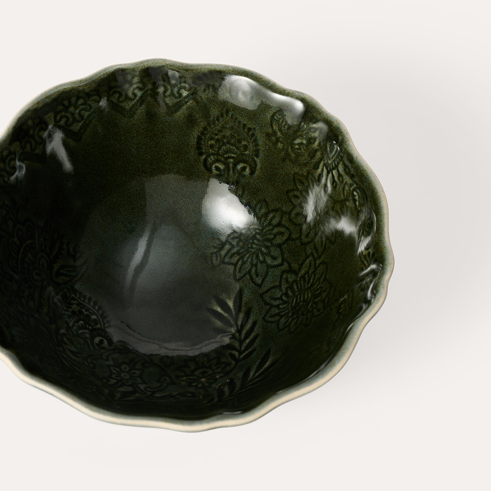 Skålen är glaserad i den ekologiska glasyren shadow – en mörkt grön färg med svärta, ofta beskriven som mossgrön.