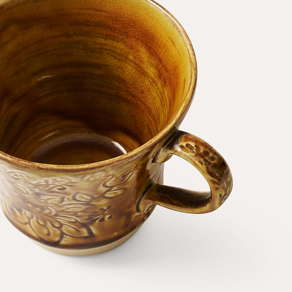 Här ses den i ananasgul som är en effektglasyr. Den har små fina krackeleringar som ger liv och variation åt keramiken. Den flödande glasyren ger en livfull yta med skiftande toner och intensitet vilket gör varje exemplar unik. Tittar du noga upptäcker du att den spännande glasyren innehåller en palett av toner och nyanser. Du upptäcker också det vackra mönstret som är så typiskt för Sthåls kollektion Arabesque. Ett spännande färgval för en god kopp tea, eller i det här fallet en god mugg tea.