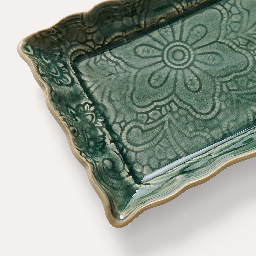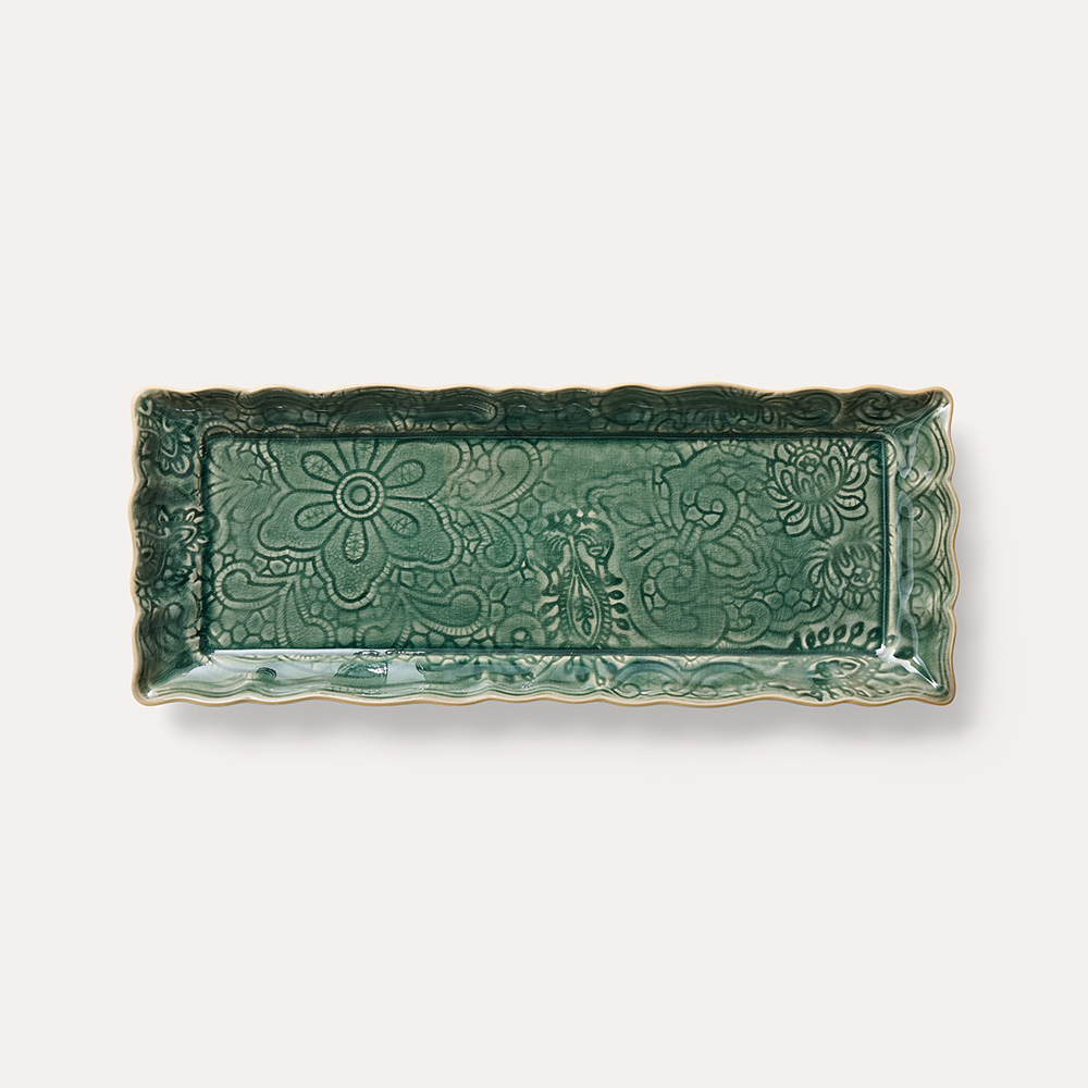 Tallrik som sätter igång lusten att laga mat. Formen gör att den är både en bricka och ett litet fat. Det vill säga ett brickfat! Här i glasyren dusk som är en effektglasyr som fångar upp många olika färgnyanser. Den vackra glasyren ger variation med fina färgskiftningar så att varje brickfat blir unikt. Samtidigt bildas en harmonisk helhet när du ställer fram flera tillsammans. Underbar redan på morgonkvisten att servera frukost på och passar också till massor av gott resten av dagen. Den långsmala tallriken är hämtad ur vår keramikkollektion Arabesque och matchar med allt annat i samma kollektion.